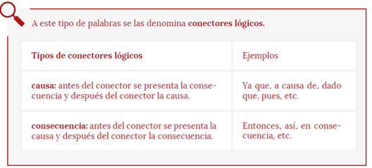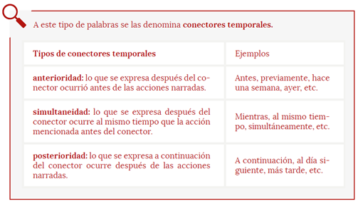 Un buen detective necesita ser claro en el orden de los hechos y preciso en las causas y consecuencias de las acciones. Cuando el narrador o el detective relatan los hechos, hay ciertas palabras que sirven para conectar las ideas, palabras que permiten: